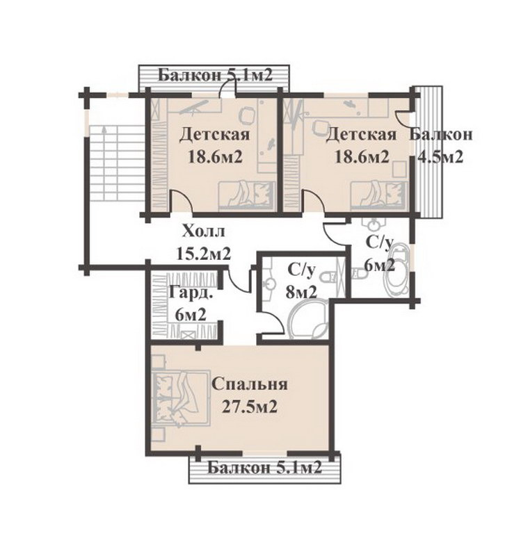 А теперь перейдем ко второму этажу, где нас ждет зона отдыха. Здесь расположены три просторные спальни с идеальным планировочным решением. Давайте познакомимся с каждой из них подробнее. Первая спальня площадью 18м2 с собственной гардеробной площадью 5м2 и выходом на балкон площадью 6,5м2. Вторая спальня площадью 24м2 также имеет свою гардеробную площадью 5м2. А третья мастер-спальня площадью 30м2 порадует вас своей просторностью и удобствами, включая собственную гардеробную площадью 10м2, ванную комнату площадью 10м2 и выход на балкон площадью 6,5м2. Также учтена общая ванная комната площадью 8м2 для еще большего комфорта и удобства.