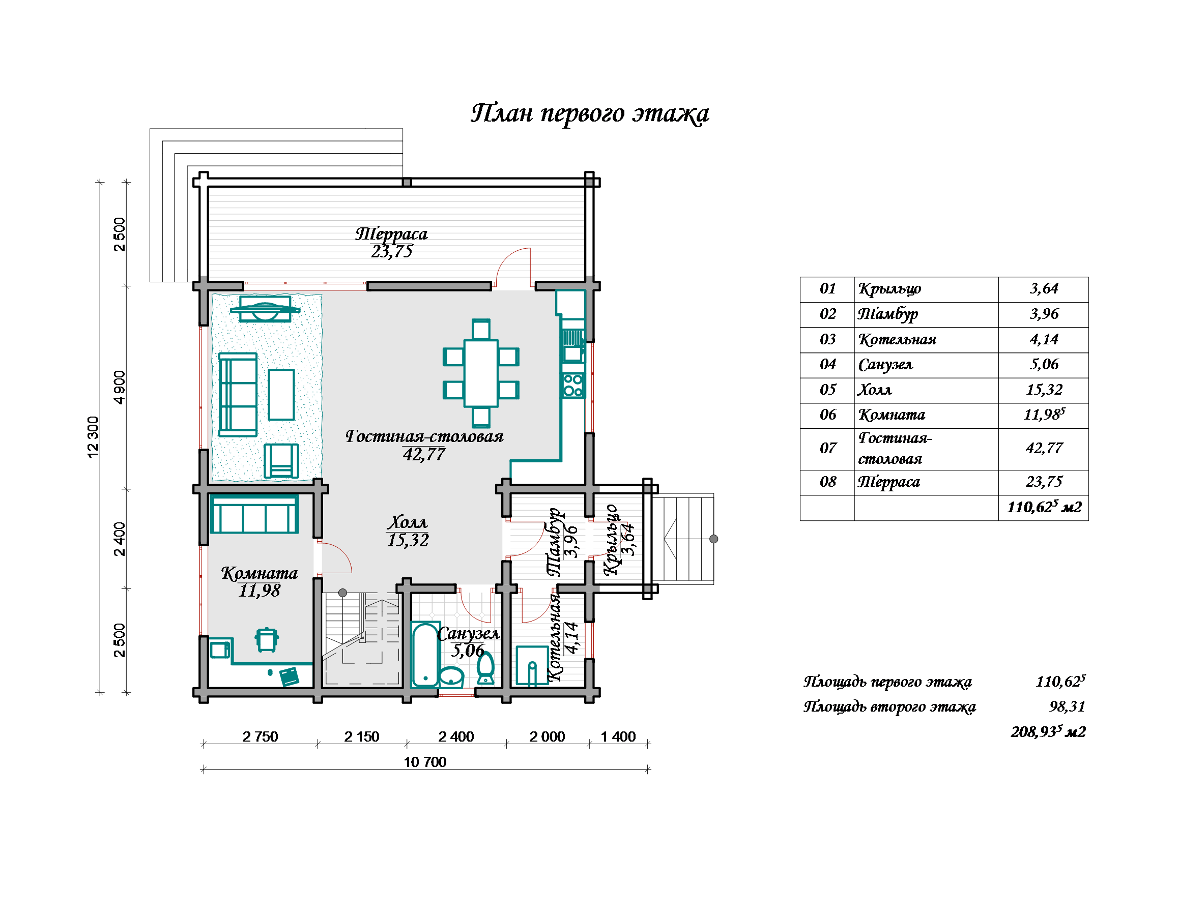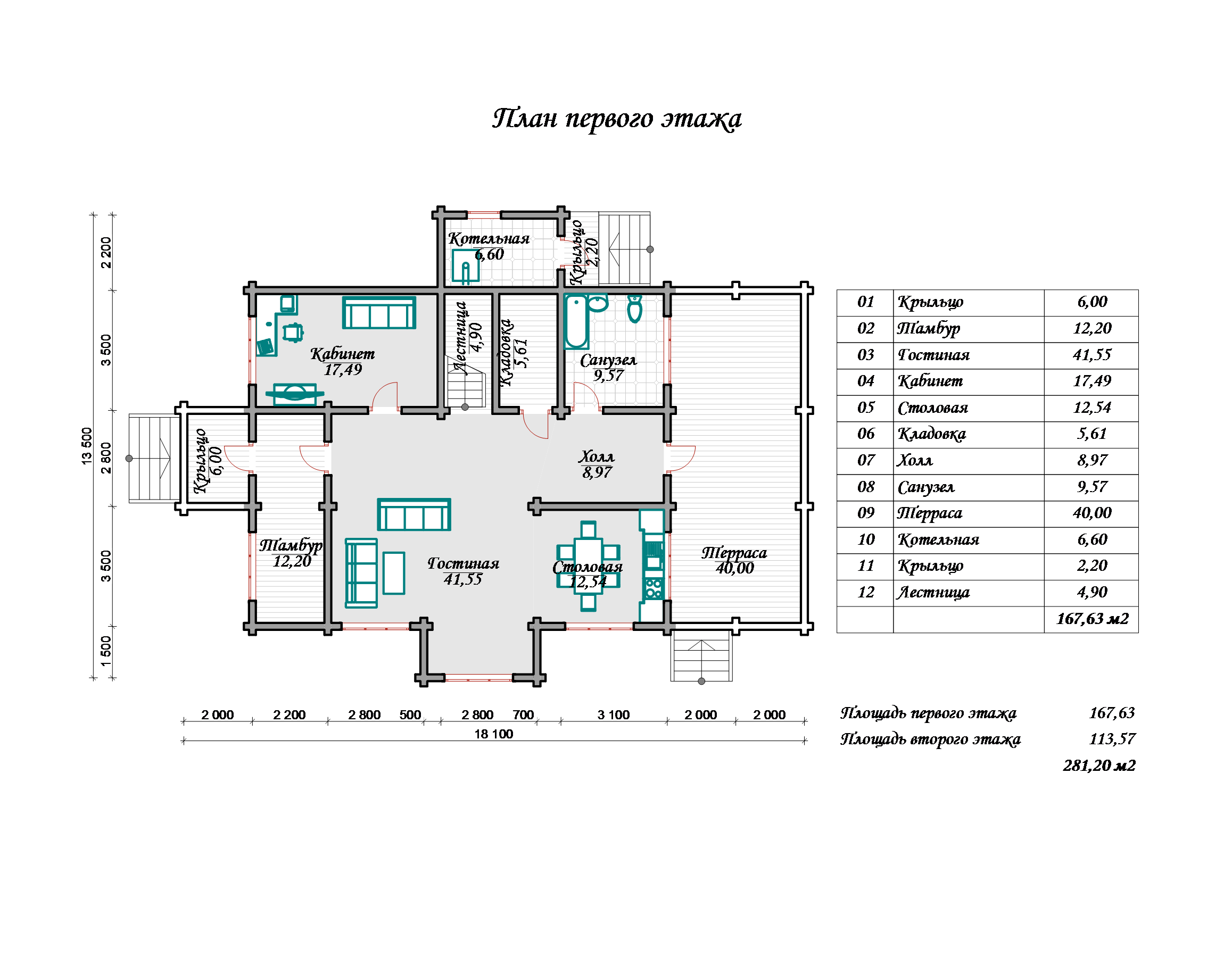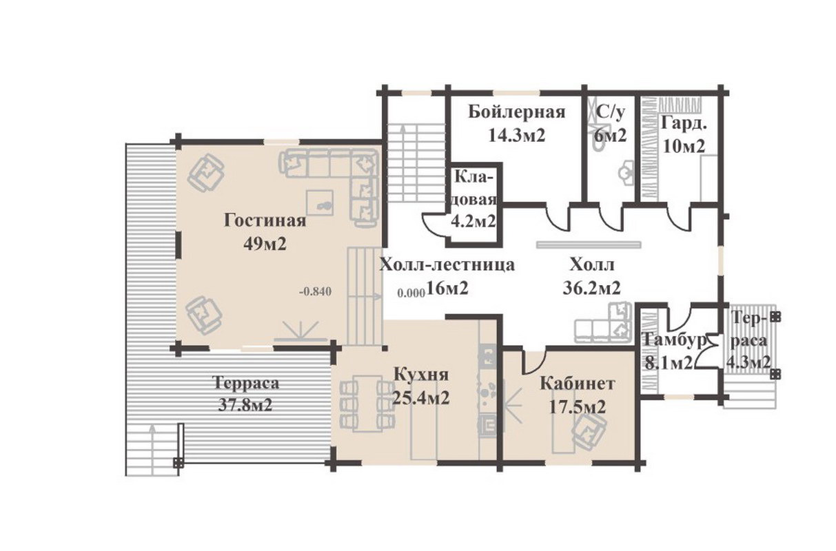 При планировании этого дома было уделено максимальное внимание каждой детали. При входе мы попадаем в тамбур-прихожую площадью 6,5м2, где вы сможете разместить мебель для хранения своих вещей. Также в проекте предусмотрено помещение котельной площадью 10м2, где будут находиться все необходимые инженерные коммуникации для обслуживания дома.