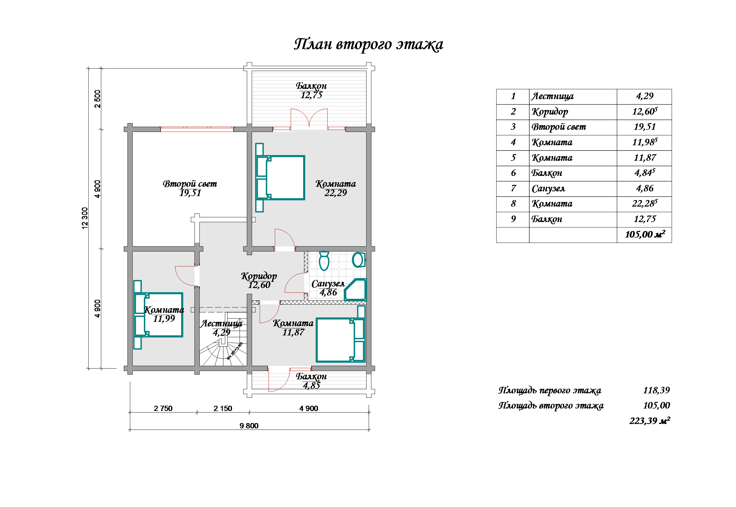 4 спальни, 2 санузла