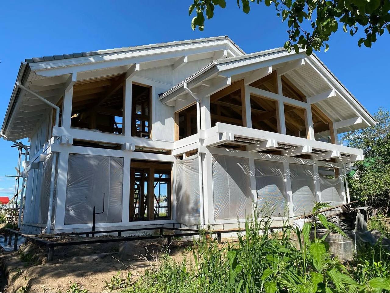 В комплектацию «Тёплый контур» входит: фундамент монолитная плита, опорно-балочная система, каркас, утепление стен и кровли, кровля, остекление, покраска фасада и клеёный брус. Без внутренней отделки.